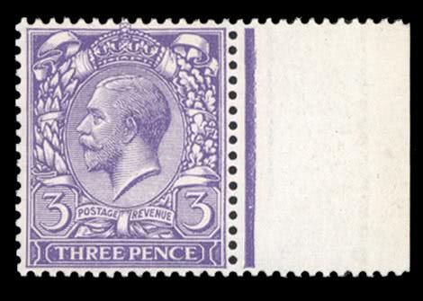 2224 | Sale number: 15 King George V: 1912–24 watermark Royal Cypher 3d. variety no watermark, fine unmounted mint, marginal from the right of the sheet. S.G. Spec. N22a. Photo. Price Realised £210 |