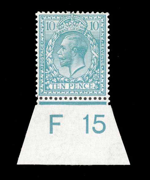 2417 | Sale number: 16 King George V: 1912–24 watermark Royal cypher 10d. turquoise-blue control ''F 15'' single, watermark type I, fine mint if a little heavily mounted. S.G. 394, Spec. N31. Photo. Price Realised £80 |