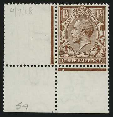 1163 | Sale number: 19 King George V: 1912–24 watermark Royal cypher 11/2d. chocolate very fine and fresh unmounted mint lower left corner marginal (mounted in margin). R.P.S. certificate (2000). S.G. Spec. N18(7). Photo. Price Realised £140 |