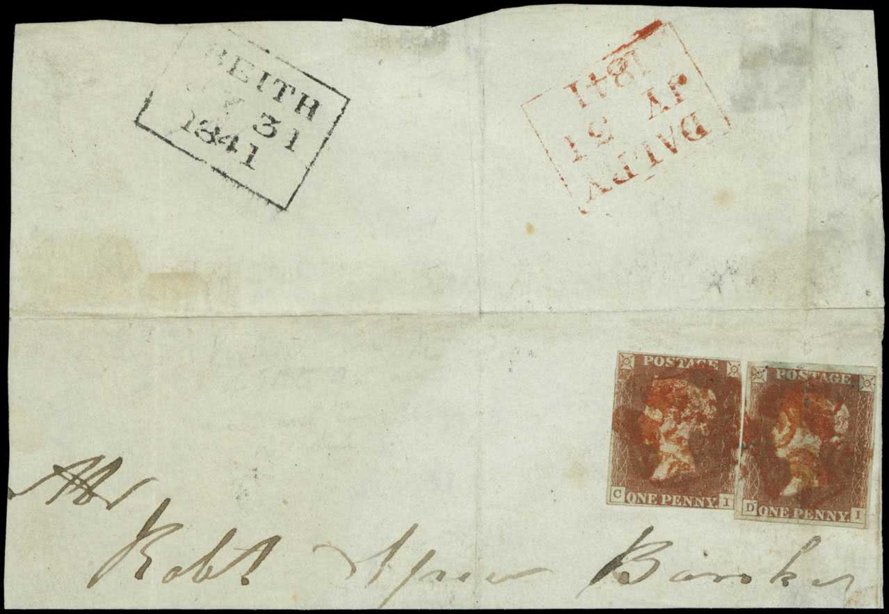 533 | Sale number: 54 Red: 1841 1d. red-brown plate 9 CI and DI used together on 1841 (July) piece with red Maltese Crosses, boxed datestamps of Dalry (in red) and Beith (black) both dated July 31st on reverse, full margins except CI touched in two places, DI crossed by vertical fold, otherwise fine and rare. Ex Williams. R.P.S. certificate (1942). S.G. Spec. AS57va, cat. £10,000+. Photo. Price Realised UNSOLD |