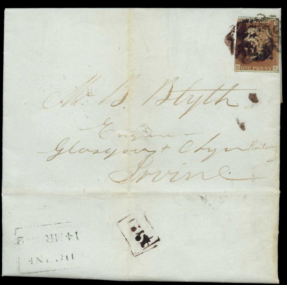 531 | Sale number: 54 Purple: 1841 1d. red-brown plate 20 SA with good margins on three sides, tied by both a clogged water-based deep purple Maltese Cross and a black Maltese Cross to 1842 (March 14th) entire letter from Glasgow to Irvine with ''Nº 21'' boxed Receiving Office handstamp in the same deep purple ink on reverse. S.G. Spec. BS9. Photo. Price Realised UNSOLD |