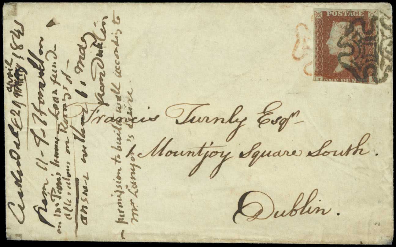 532 | Sale number: 54 Red and Black: 1841 1d. red-brown plate 8 IA cut into at foot but good margins other sides, cancelled clear light red Maltese Cross of Cushendall on 1841 (April 29th) envelope to Dublin and additionally cancelled on arrival by the normal Dublin Maltese Cross, recipients manuscript notes on front well clear. Rare. B.P.A. certificate (2001). S.G. Spec. AS47vk, unpriced. Photo. Price Realised UNSOLD |