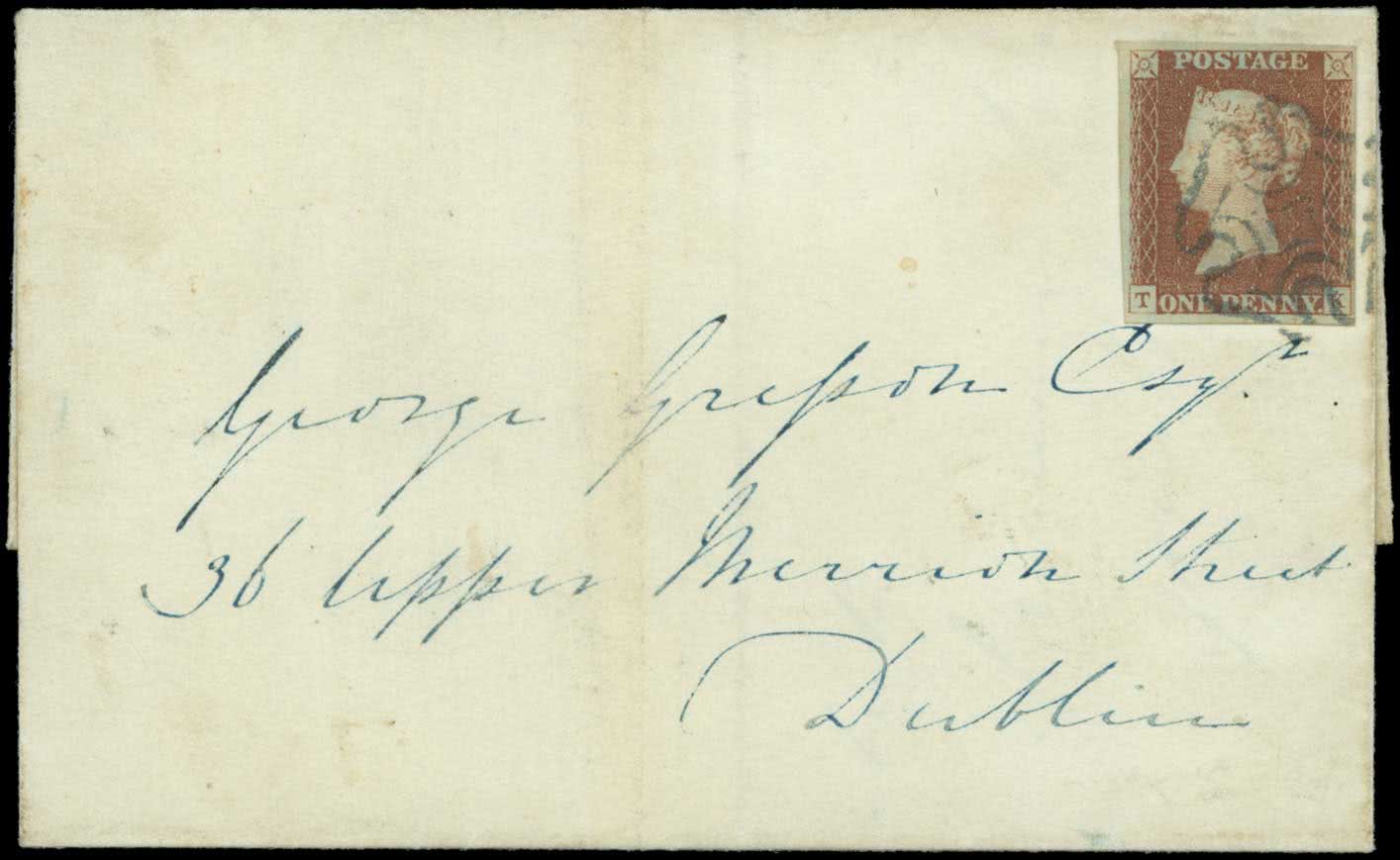 528 | Sale number: 54 Blue (Kells): 1841 1d. red-brown plate 5 TK state 1 pre-provisional printing exceptionally fine used with good to large margins and a fine strike of the blue Maltese Cross of Kells on 1842 (Sept. 19th) cover to Dublin, filing fold well clear. Rare. B.P.A. certificate (1997). S.G. Spec. AS35vc, cat. £7,000. Photo. Price Realised UNSOLD |