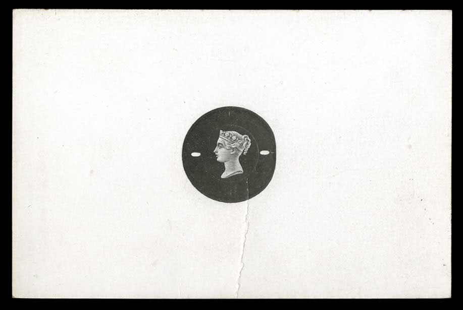 Post Office Telegraph Stamps: 1875 die proof of unadopted small size head (10.4mm) in black with uncleared circular surround with slots on either side, on glazed card (92 x 61mm) without markings, vertical crease at foot extends to circular surround but clear of head, otherwise fine, this stage not listed by S.G. Photo.