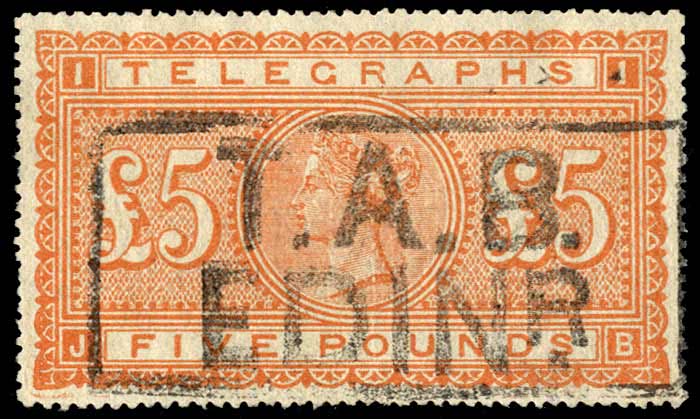 Post Office Telegraph Stamps: 1877 watermark shamrocks £5 orange CE of good colour, ''WEST STRAND/JA 3/81'' c.d.s. and ''T.M.B./G.P.O.'' boxed cancellation, some creasing and tone spots, otherwise fine and of good colour. S.G. Spec. L237. Photo.