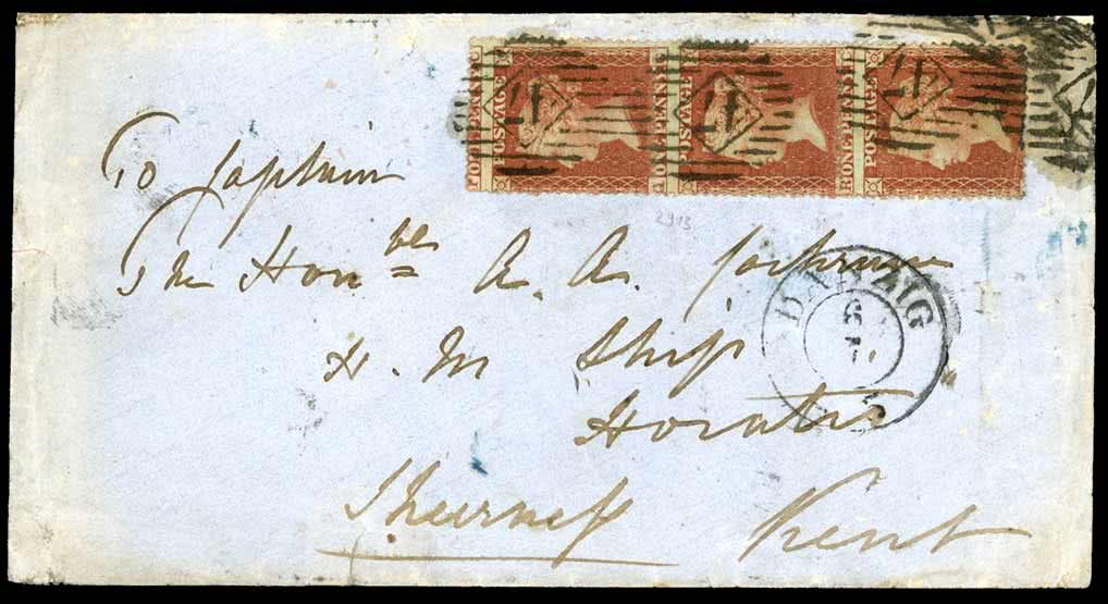 738 | Sale number: 24 Used Abroad: Crimea: 1854 (July 6th) envelope to HMS Horatio at Sheerness, 3d. prepaid concessionary combined British and Foreign rate for letter from British Baltic Fleet, carried by Prussian Post from Danzig via London with misperforated SC16 1d. QC-SC vertical strip of three cancelled London Inland Office ''47'' multiple obliterator issued on June 30th 1854, ''DANZIG/6/7'' below adhesives, most unusual. Ex Hennig. Photo. Price Realised UNSOLD |