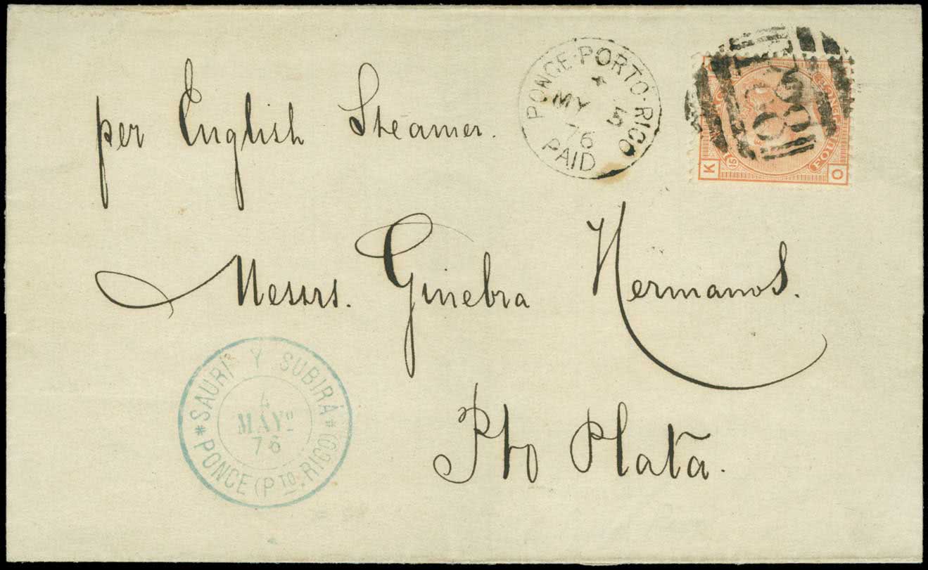 160 | Sale number: 54 Used Abroad: Porto Rico: 1876 (May 5th) cover to Porto Plata, franked by 1876 4d. vermilion plate 15 OK, tied by ''F88'' barred oval with ''PONCE-PORTO RICO PAID'' c.d.s. alongside, a fine clean item. Photo. Price Realised UNSOLD |
