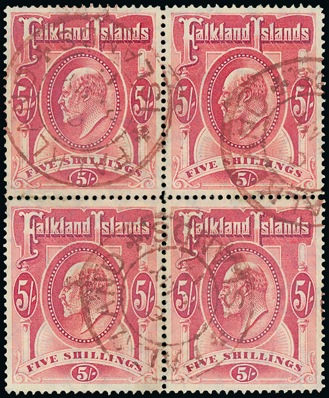 5057 | Sale number: 103 Falkland Islands: 1904-12 5s. red block of four, used with F.4Ev1 ''2 MY/13'' c.d.s. cancellations in brown, the lower left stamp with pressed creases otherwise fine. S.G. 50, cat. £600+. Photo. Price Realised UNSOLD |