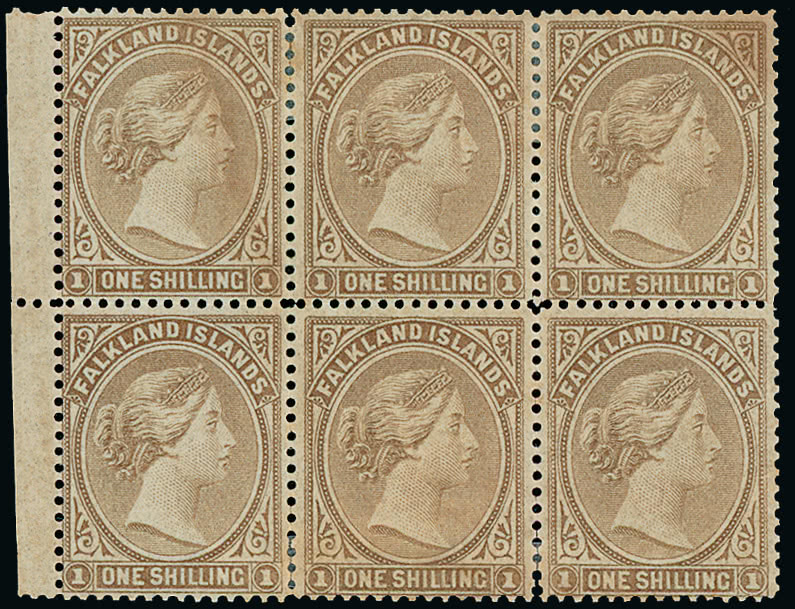 5007 | Sale number: 103 Falkland Islands: 1878-79 no watermark 1s. bistre-brown, mint block of six (3 x 2), marginal at right, some gum toning and perf. reinforcement but a scarce multiple. SH 4, S.G. 4, cat. £510+. Photo. Price Realised UNSOLD |