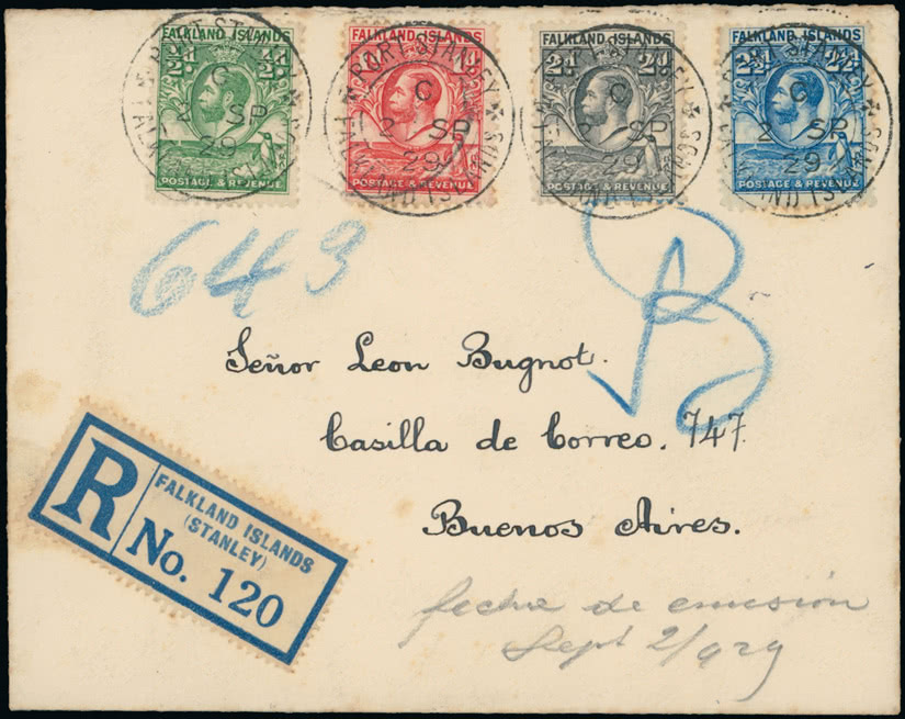 5086 | Sale number: 103 Falkland Islands: 1929-37 'Whale & Penguin' 1/2d., 1d., 2d. and 21/2d. used on first day on cover unusually registered to Buenos Aires, individual PS.1A cancellations, type 5D registration label, Nov. 26 arrival backstamps, slight toning but scarce. Photo. Price Realised UNSOLD |