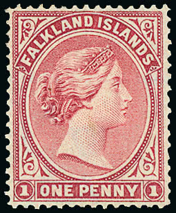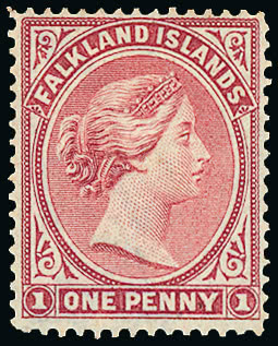 5011 | Sale number: 103 Falkland Islands: 1882 Watermark Upright, 1d. dull claret, mint, fine. SH 6a, S.G. 5, cat. £325. Photo. Price Realised £140 |