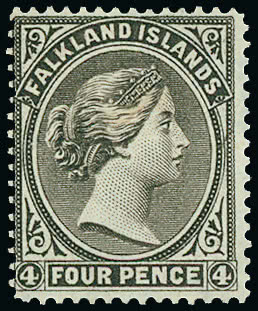 5019 | Sale number: 103 Falkland Islands: 1887 Watermark Sideways, 4d. grey-black, watermark Crown to right of CA, mint, fine. SH 9cwmk1, S.G. 10w, cat. £450. Photo. Price Realised £280 |