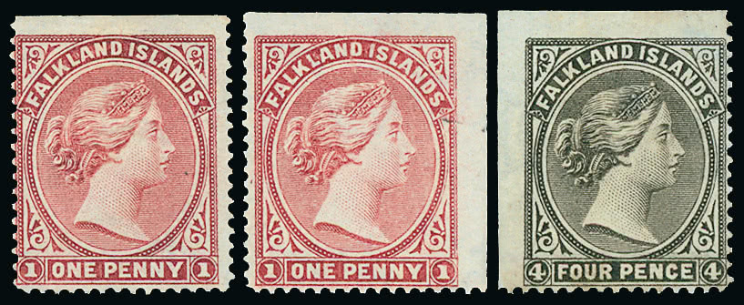 5022 | Sale number: 103 Falkland Islands: 1889 Watermark upright, 4d. olive grey-black, mint, unused (3, one watermark reversed, another showing marginal letters), some imperfections. S.G. 12, x, cat. £1,300. Price Realised £80 |