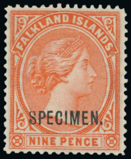 5013 | Sale number: 103 Falkland Islands: 1885 1d. pale claret, watermark Crown to left of CA, handstamped ''Specimen'' (Samuel type FI1) in black, a little smudged, fine without gum. S.G. 7s. Photo. Price Realised £80 |