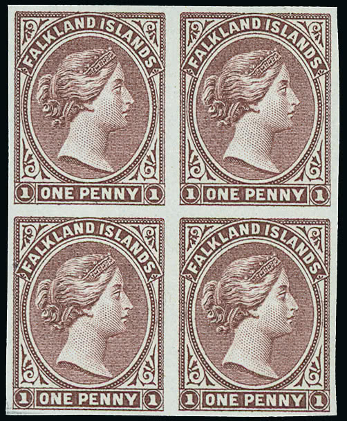 Falkland Islands: Queen Victoria Proofs and Specimens: Colour Trials, 1d. imperforate colour trial in brown on wove paper, a block of four, one with trivial ink spot in margin on reverse otherwise fine. Photo.