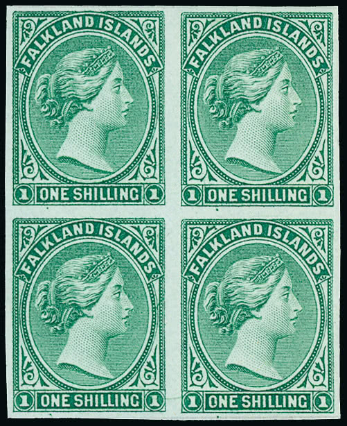 Falkland Islands: Queen Victoria Proofs and Specimens: Colour Trials, 1s. imperforate colour trial in green on wove paper, a block of four, fine. Photo.