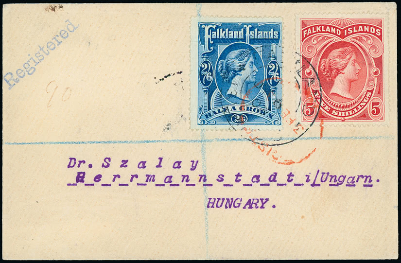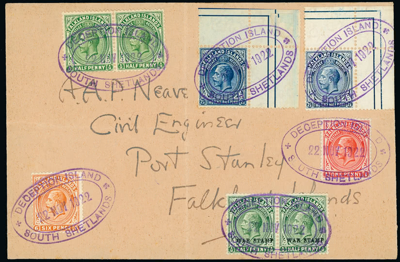 Falkland Islands Dependencies: South Shetlands: 1922 (Nov. 22) an exceptional envelope addressed to Civil Engineer A.A.P. Neave in Port Stanley bearing 1912-20 1d., 21/2d. (corner marginal), 6d., 1918-20 ''WAR STAMP'' 1/2d. pair, 1921-28 1/2d. pair and 21/2d. (corner marginal) cancelled by six fine strikes of type B1 ''DECEPTION ISLAND/22 NOV 1922/SOUTH SHETLANDS'' double oval datestamp in violet, with May 1 arrival c.d.s. on reverse, vertical cover fold clear of adhesives and strikes. Photo.