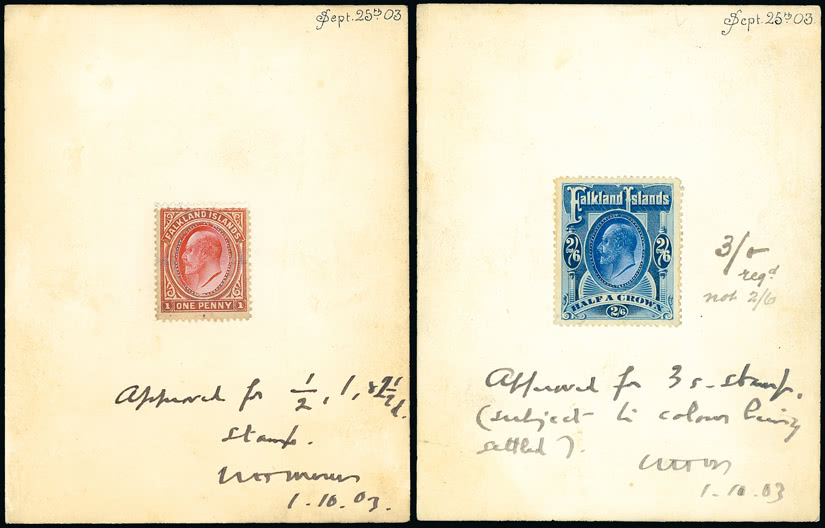 Falkland Islands: Queen Victoria Proofs and Specimens: Die Proofs, 1898 2s.6d. deep blue and 5s. red imperforate die proofs in issued colours on thin card. Photo.