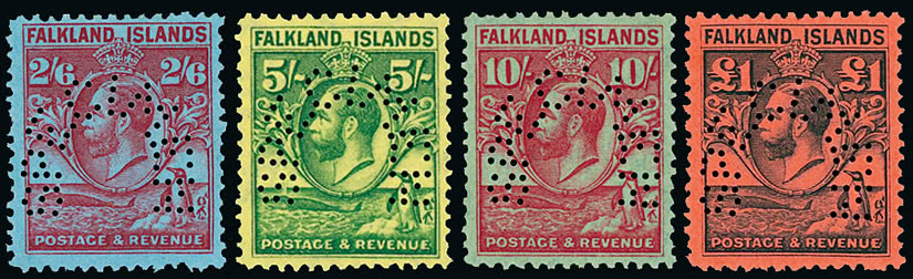 Falkland Islands: 1935 Silver Jubilee 1d. to 1s. set perforated ''SPECIMEN'' (Samuel type B9), the 4d. and 1s. lower marginal, the 1s. with small patch of disturbance otherwise fine with full gum. S.G. 139s-42s, cat. £475. Photo.