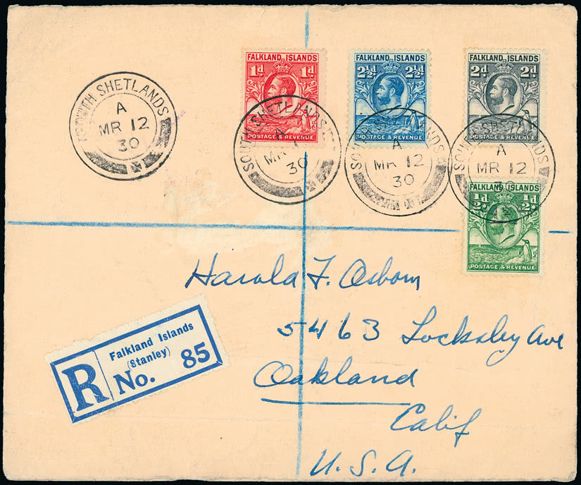 Falkland Islands Dependencies: South Shetlands: 1930 (Mar. 12) envelope registered to California bearing 'Whale & Penguin' 1/2d., 1d., 2d. and 21/2d., with four mainly fine B.2 c.d.s's, Stanley type 6B registration label at left, showing Port Stanley Mar. 25 and other transit backstamps with Oakland May 13 arrival, slight cover creasing. Photo.
