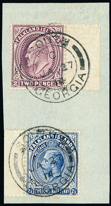 Falkland Islands Dependencies: South Georgia: 1904-12 2d. purple and 1912-23 21/2d. deep bright blue (S.G. Z16, Z25), both marginal examples tied to piece by fine SG1 ''JA 27/14'' c.d.s's, ex Taylor collection, 1912-20 also 'Mcleod' cover bearing 1904-12 1d. with fake ''South Georgia'' imprint and Falkland Islands c.d.s.