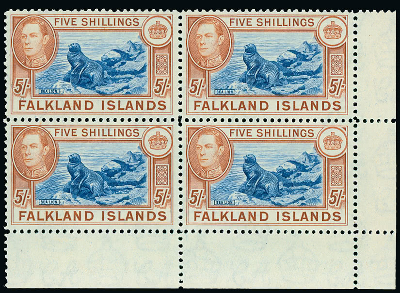 Falkland Islands: 1938-50 5s. dull deep blue and dark yellow-brown, 1944 printing, a mint block of four, lower right corner marginal, hinged in margin only, a few light diagonal bends otherwise fine. Heijtz certificate (2012). SH 91c, S.G. 161c, cat. £480+. Photo.