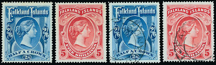 Falkland Islands: Queen Victoria Proofs and Specimens: Specimen Stamps, 1898 2s.6d. deep blue and 5s. red overprinted ''SPECIMEN'' (Samuel type B2), fine with gum. S.G. 41s, 42s, cat. £550. Photo.