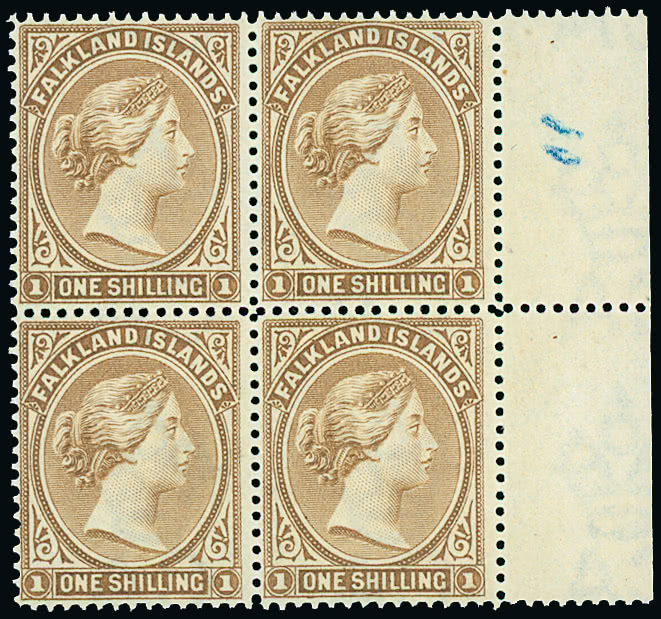 Falkland Islands: Queen Victoria Proofs and Specimens: Colour Trials, 1s. imperforate colour trial in olive-black on wove paper, a block of four, fine. Photo.