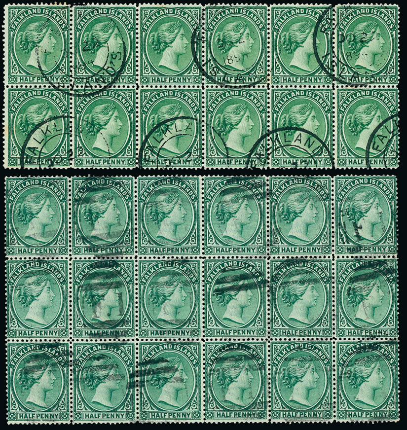 Falkland Islands: Queen Victoria Proofs and Specimens: Specimen Stamps, 1889-91 1d. red-brown and 4d. olive grey-black handstamped ''SPECIMEN'' in red (16.5 x 2mm and 11.5 x 1mm respectively), without gum, in matching blocks of thirty with marginal straight edges on three sides, the lower three rows from the single sheet of sixty. Ex Bradbury Wilkinson archives. (60) Photo.