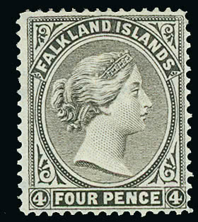 Falkland Islands: 1885-91 Watermark Crown CA Sideways 4d. pale grey-black, Crown to left of CA, mint, fine. S.G. 9, cat. £850. Photo.