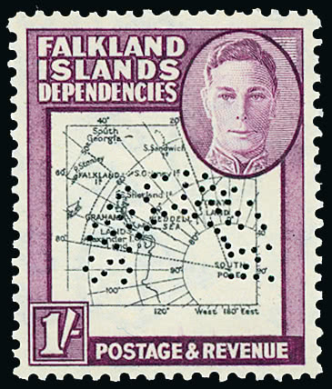 Falkland Islands Dependencies: 1946 Thick Map 1/2d. to 1s. set perforated ''SPECIMEN'' (Samuel type B9), mainly fine with gum. (8) S.G. G1s-8s, cat. £1,100. Photo.