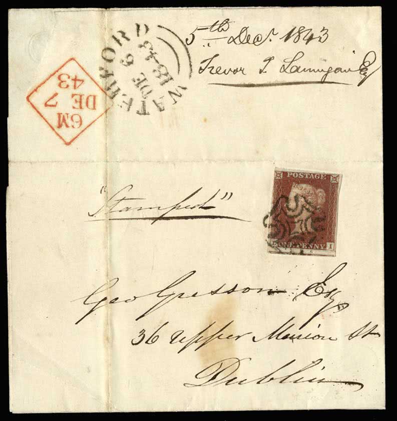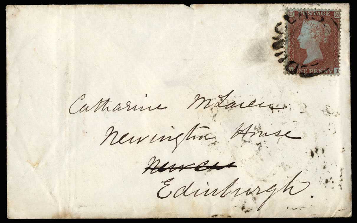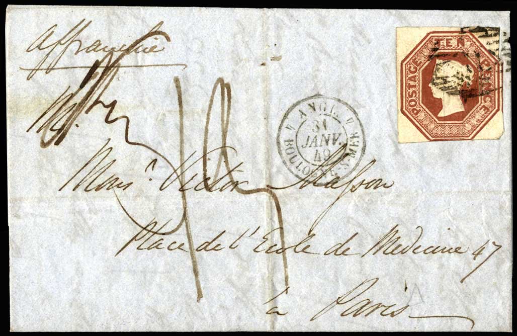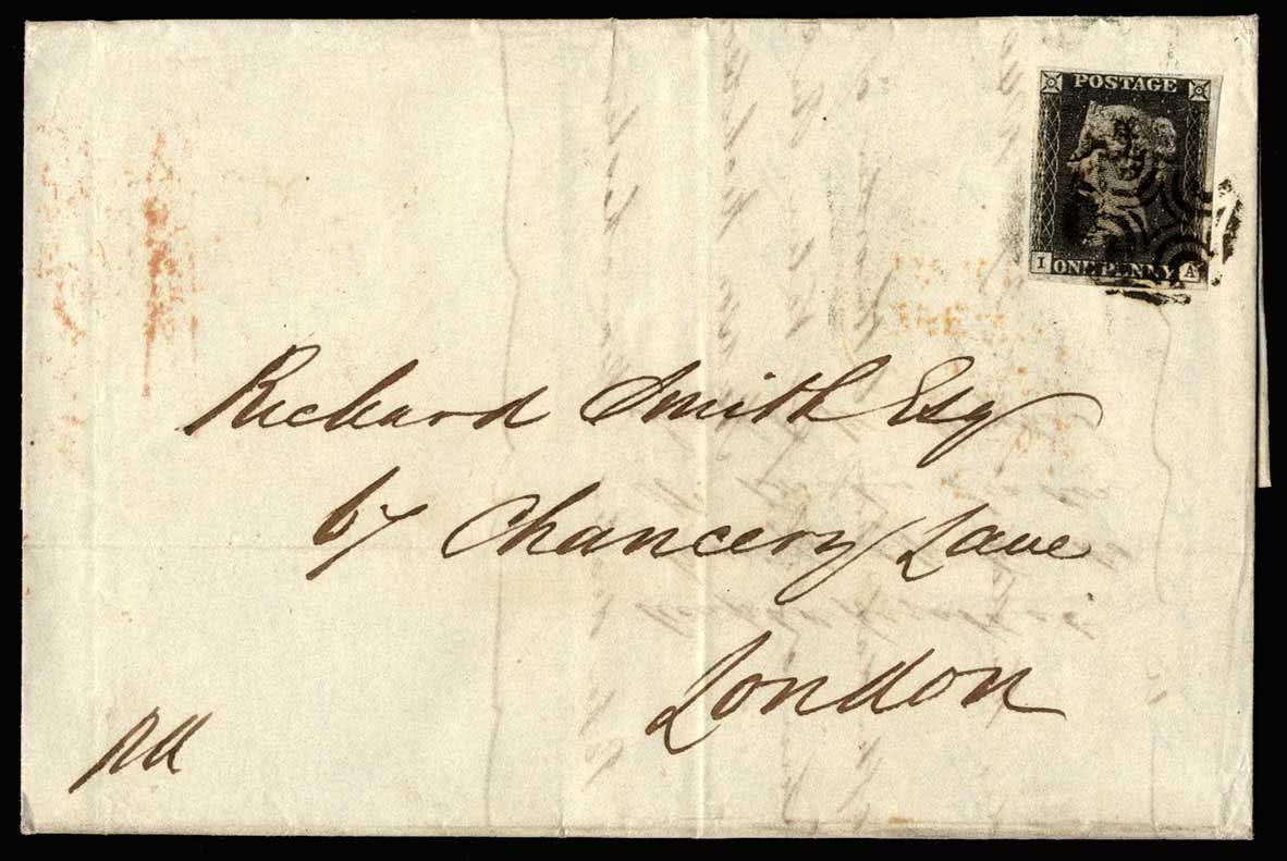 Collections and Mixed Lots: 1840–70 various mostly covers incl. 1840 (Oct.) envelope from London to Abergavenny bearing 1840 1d. PL with three margins, placed upside down and with red Maltese Cross leaving the Queen completely clear, 1840 (Nov.) from London to Ayr, redirected three times and variously paid in cash and once with 1840 1d. LK, 1846 (Sept.) cover from India to London via Southampton, redirected from London to Somerset with 1841 1d. NH, 1854 (Jan.) cover from London to Dieppe bearing 1841 2d. plate 4 PG-PK strip of five, etc., also 1938 International Labour Office letter sheet bearing 1937–47 1/2d., 1d., 11/2d. and 21/2d. cancelled ''GOVERNING BODY/I.L.O./24 OC/38/LONDON W.1'' c.d.s's. (18 items).