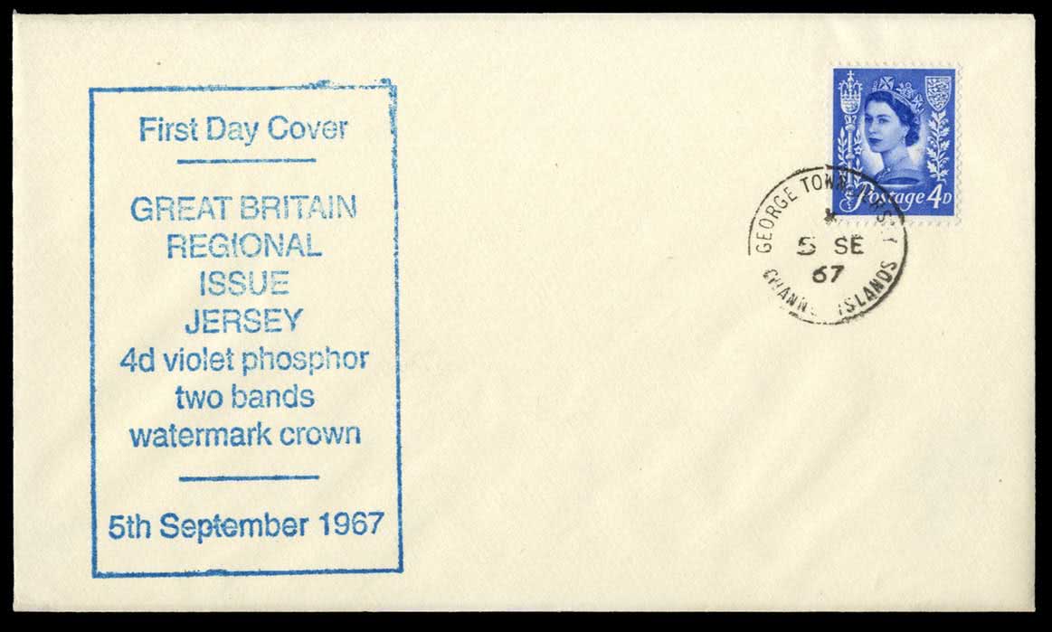 Jersey: 1943-44 1d. half sized die proof in pink and maroon on India paper (132 x99mm), differs from issued with three ornamental lines below picture and initials ''E B'' one each side of the value. Photo.