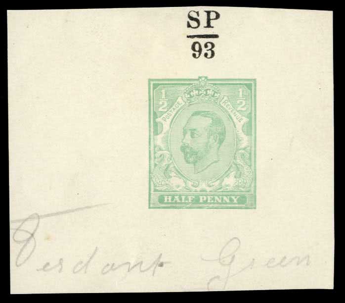 Jersey: 1943-44 1/2d. half sized die proof essay in pale green and red on India paper (132 x 99mm). Photo.
