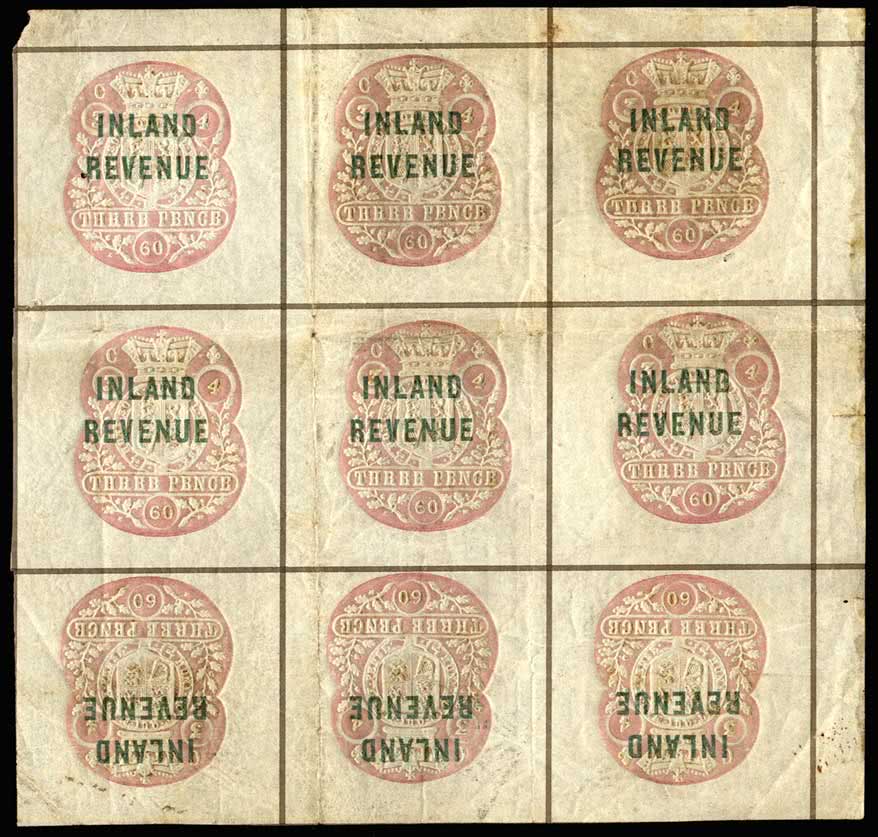 Collections and Mixed Lots: A Q.V. surface printed selection, comprising 1865-67 4d. plate 14 IC, 1867-80 9d. plate 4 GG, 1873-80 21/2d. rosy-mauve plate 4 HC showing missing perf pin at top and base, 1883-84 5d. dull green QH, mint or unused, I.R. Official 18823-85 21/2d. lilac IA and 6d. grey plate 18 HK overprinted ''SPECIMEN'' type 9, fair to fine. (6).