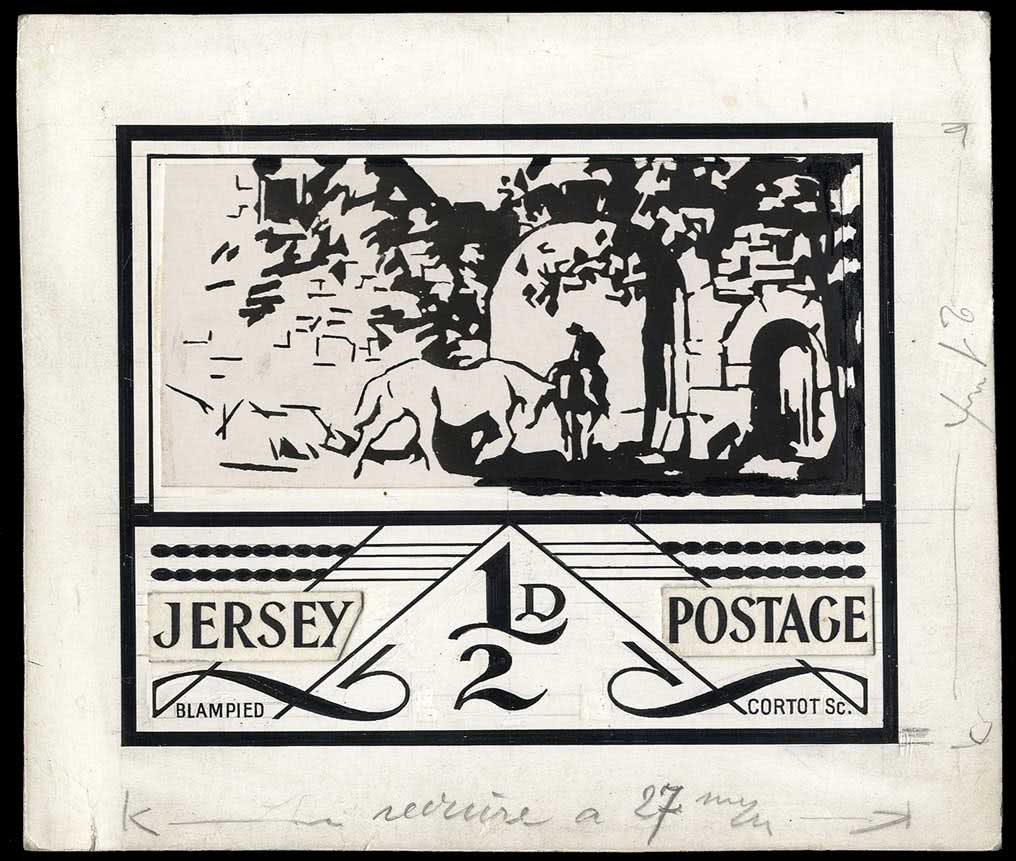 Jersey: 1943–44 11/2d. composite essay (117 x 100mm), produced by M. Henri Cortot, the make-up consisting of a photograph of the scene with hand-drawn frames and value tablets, with marginal pencil instruction to reduce to stamp size, believed to be unique. Photo.