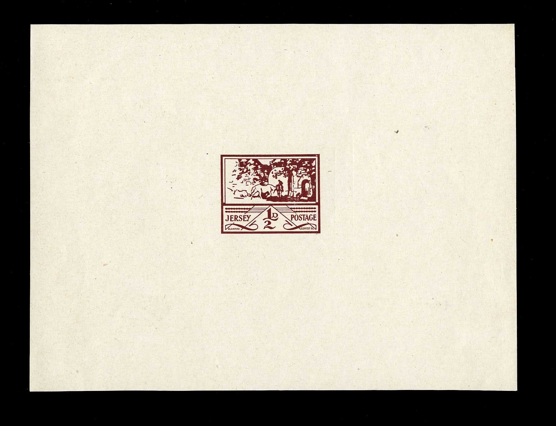 Full Sized Die ProofsJersey: 1943-44 1/2d. sunken die proof in black on white card (130 x 107mm), scarce. Photo.