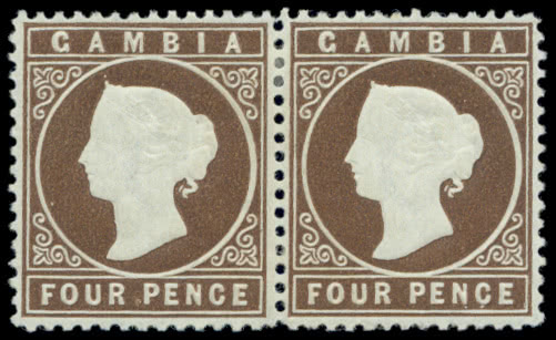 Gambia: 1869-72 Imperforate, No Watermark 4d. brown, fresh mint horizontal pair, crisp embossing, most attractive. S.G. 1. B.P.A. certificate (2003). Photo.