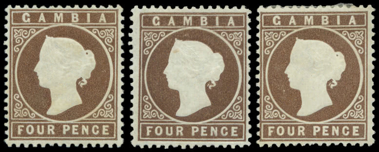 Gambia: 1874 Imperforate, Watermark Crown CC 4d. brown, three used example with full margins, also another with faults. S.G. 5. Photo.