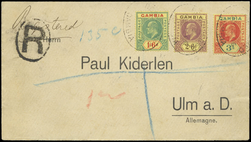 Gambia: Cancellations and Postal Markings: Travelling Post Offices, a collection in an album, incl. 1924 (Jan. 19) envelope to Scotland bearing 1912-22 21/2d. and 10d., cancelled “T.P.O./RIVER.GAMBIA” c.d.s’s, also handstruck “R”, 1927 (June 25th) 3d. registered envelope size H, cancelled “T.P.O. No. 2/RIVER.GAMBIA” c.d.s. with matching registered cachet, etc. (245 stamps, 56 items)