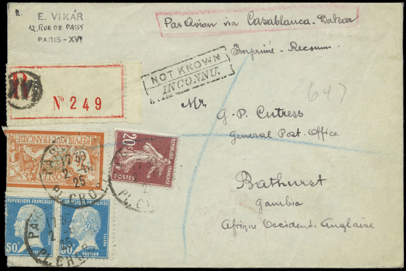 Gambia: Later Covers: Airmails: 1925 (Oct. 2) envelope registered from Paris to Bathurst, endorsed “Par Avion via Casablanca-Daker” with boxed “NOT KNOWN/INCONNU.”, two French stamps with faults, otherwise fine. Photo.