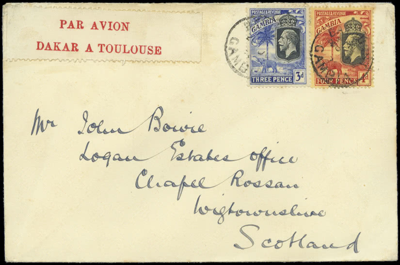 Gambia: Later Covers: Airmails: 1928 (July 2) envelope from Bathurst to Scotland, franked by 1922-29 3d. and 4d. bearing scarce label “PAR AVION/DAKAR A TOULOUSE”, fine. Photo.