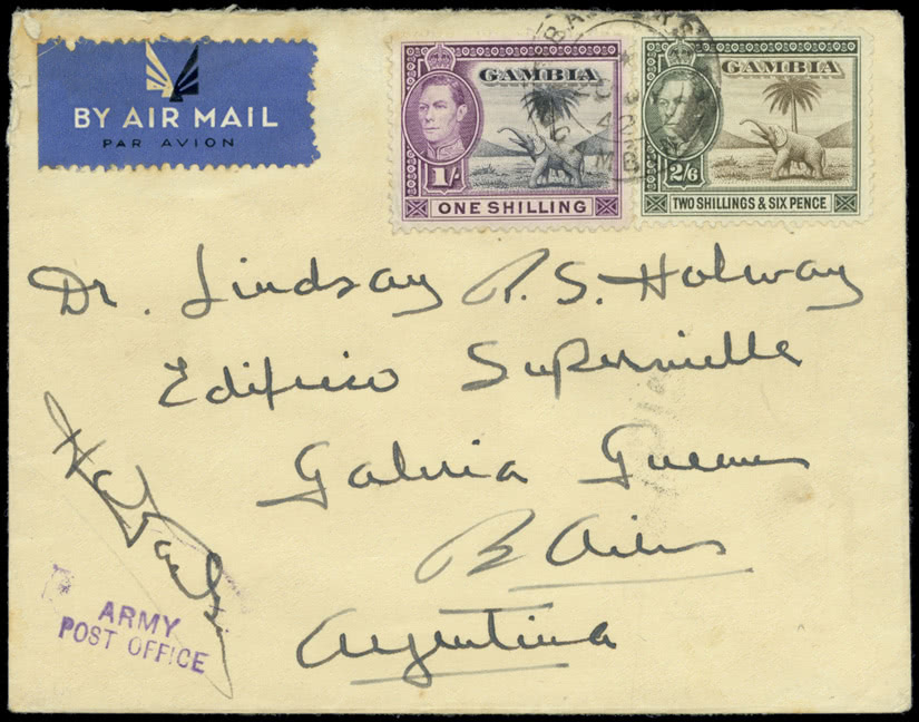 Gambia: Later Covers: World War II: 1942 (July 20) envelope from Bathurst to Argentine, bearing 1938-47 1s. and 2s.6d., bearing a fine strike of the rare “ARMY/POST OFFICE” in violet, stated to be the only known example. Photo.