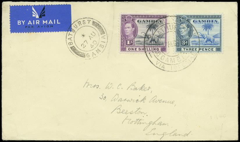Gambia: Later Covers: Telegrams: 1940 (Aug. 27) envelope to England, bearing 1938-46 3d. and 1s. tied by “SEND YOUR TELEGRAMS/BATHURST/GAMBIA/VIA IMPERIAL” datestamp type Tel 4, with Bathurst c.d.s. alongside. Photo.