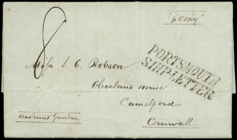 Gambia: The Robson Correspondence: 1845 (Aug. 23) entire from Bathurst River to Cornwall, endorsed “p. Cony” with “8” rate mark, also two line “PORTSMOUTH/SHIP-LETTER”. The letter refers to his duties as Quarantine Officer and the necessity of being strict in the execution of his duty with vessels coming from Sierra Leone and the Leeward Coast. Photo.
