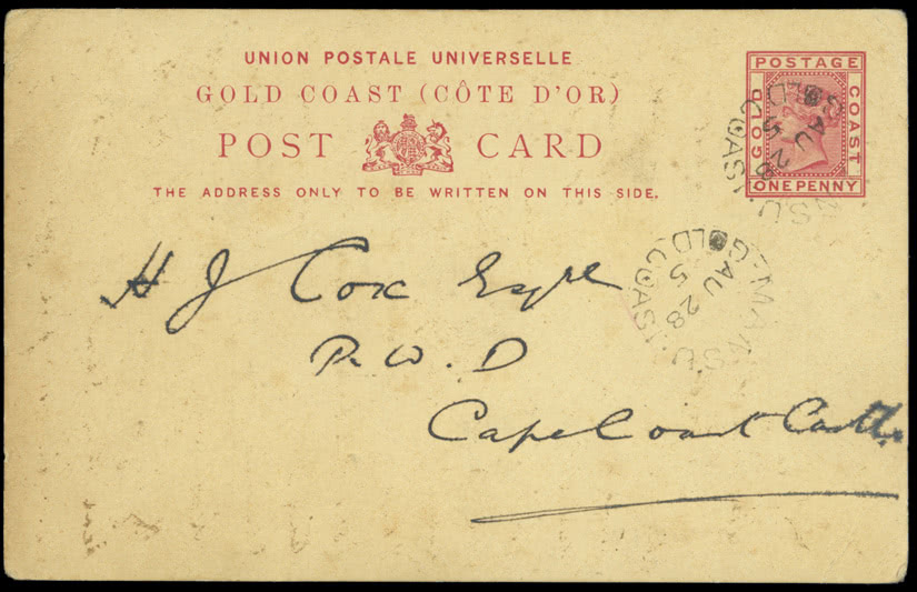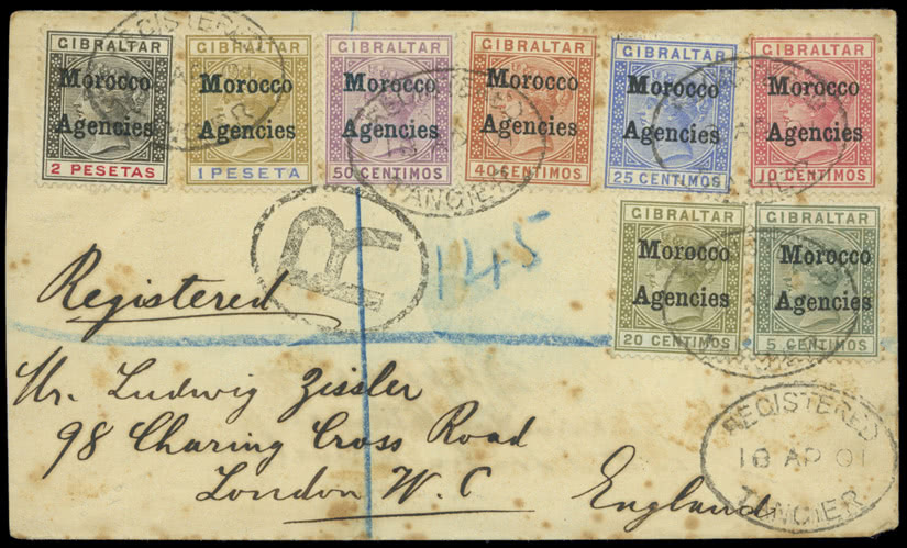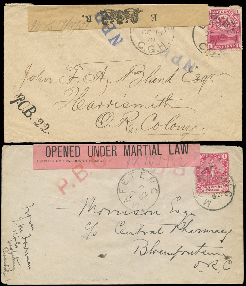 A British Empire collection in four albums with main strength in British Africa, incl. G.B. 1840 1d. (13) used, 1841 1d’s from ‘black’ plates on covers incl. plate 1b, 1883-84 2s.6d. lilac mint, Bahrain 1938-41 to 25r. (less 8a.) mint, B.E.A. Specimens incl. 1897-1903 50r., Cape of Good Hope from 1748 pre-stamp covers incl. 1813 cover with fine “SHIP LETTER/CAPE OF GOOD HOPE” double oval with Crown, good range of triangulars (39) mint and used, mainly fine, incl. pairs, 1861 Woodblock 4d. used, 1900 Mafeking overprint selection (21) used, Baden-Powell 3d. (181/2mm) used, Gambia Specimens, Gold Coast Q.V. to K.G.V Specimens incl. 1924 15s., Ireland 1927-28 wide date 2s.6d. to 10s. sets (2) mint, K.U.T. 1922-27 to £1 mint, Lagos 1884-86 set to 10s. mint and 5s. and 10s. optd. “SPECIMEN”, 1887-1902 to 10s. mint, 1904-06 to 10s. mint, Specimen values to 10s., Nigeria 1914-29 to £1 mint, 1921-32 to 10s. dies I and II mint, 1936 to £1 mint, Northern Nigeria 1912 to £1 mint, Nyasaland 1908 set to £1 optd. “SPECIMEN”, Somaliland 1903 overprint at top of stamp set to 5r. mint, 1904 to 5r. mint, 1912-19 to 5r. optd. “SPECIMEN”, Southern Nigeria 1907-11 to £1 overprinted“SPECIMEN”, British Africa covers and postal stationery incl. Bechuanaland, Northern Nigeria registered covers, Tanganyika 1930’s airmails, etc., varied condition. (100s)