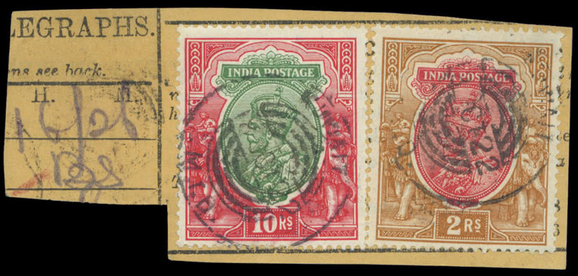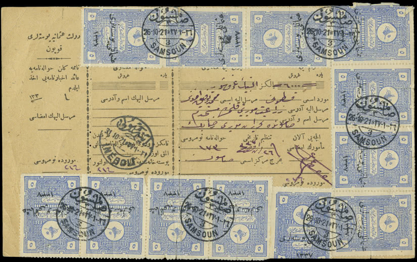 Turkey: 1921 overprinted on Religious Tribunal 5pi. ultramarine, twelve examples used on parcel card, cancelled by “SAMSOUN” c.d.s.’s, all with scissor-cuts or other faults, very rare. Ex Straus. S.G. A39. Photo.
