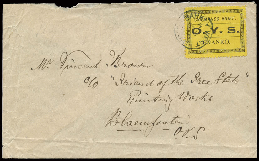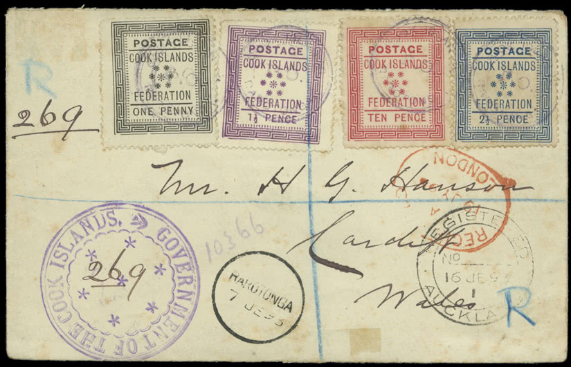 Uganda: 1896 (Nov.) Typeset 1a. (thick “1”) to 5r. used on 1899 (Mar. 9) envelope, registered to Cape Town (part of name excised and part of reverse removed), 1a. and 2a. tied by oval framed “R”, others uncancelled, in combination with 1898-1902 1a. cancelled by Mombasa squared circle, scarce. Ex Straus. S.G. 55-61. Photo.