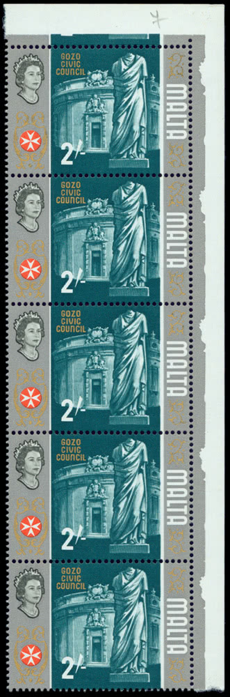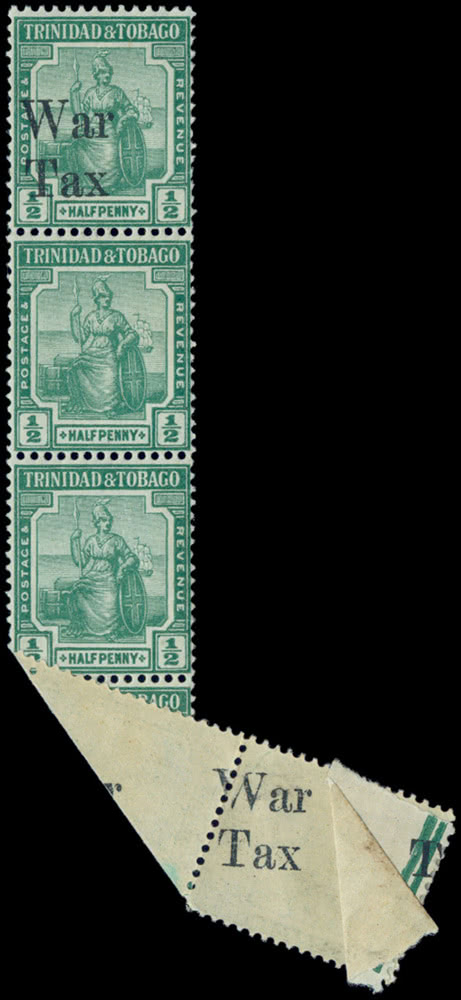 Trinidad and Tobago: 1917 (Feb.-Dec.) War Tax 1/2d. bluish-green, mint vertical strip of five, variety four without overprint, also overprint appears on reverse of the lower stamp due to paper fold, fine and scarce. S.G. 187a, cat. £1,500. Photo.