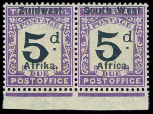 South West Africa: Postage Dues: 1923-26 Setting IV on Transvaal 5d. black and violet, fine unmounted mint. S.G. D17a, cat. £800+. Photo.